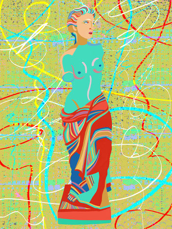 After the sudden loss of my husband, I often create art that explores the themes of memory, as well as change and loss in relationships and our environment. One morning, I woke up and looked at the statue of the Venus De Milo that I have had since childhood basking in the sunlight. I thought how much I loved the statue and how long Venus has been a treasure of mine, an armless constant of beauty through y 60 years of life. I thought that at the time she was created in the 2nd century BC, there were no plastics no phones nor electricity. Pure and white I pictured my Venus in a more modern and colorful scenario representing the dance of lire; the good and bad, the joy and pain and most especially how much changes over time and how much stays the same and in that movement there is creation.
